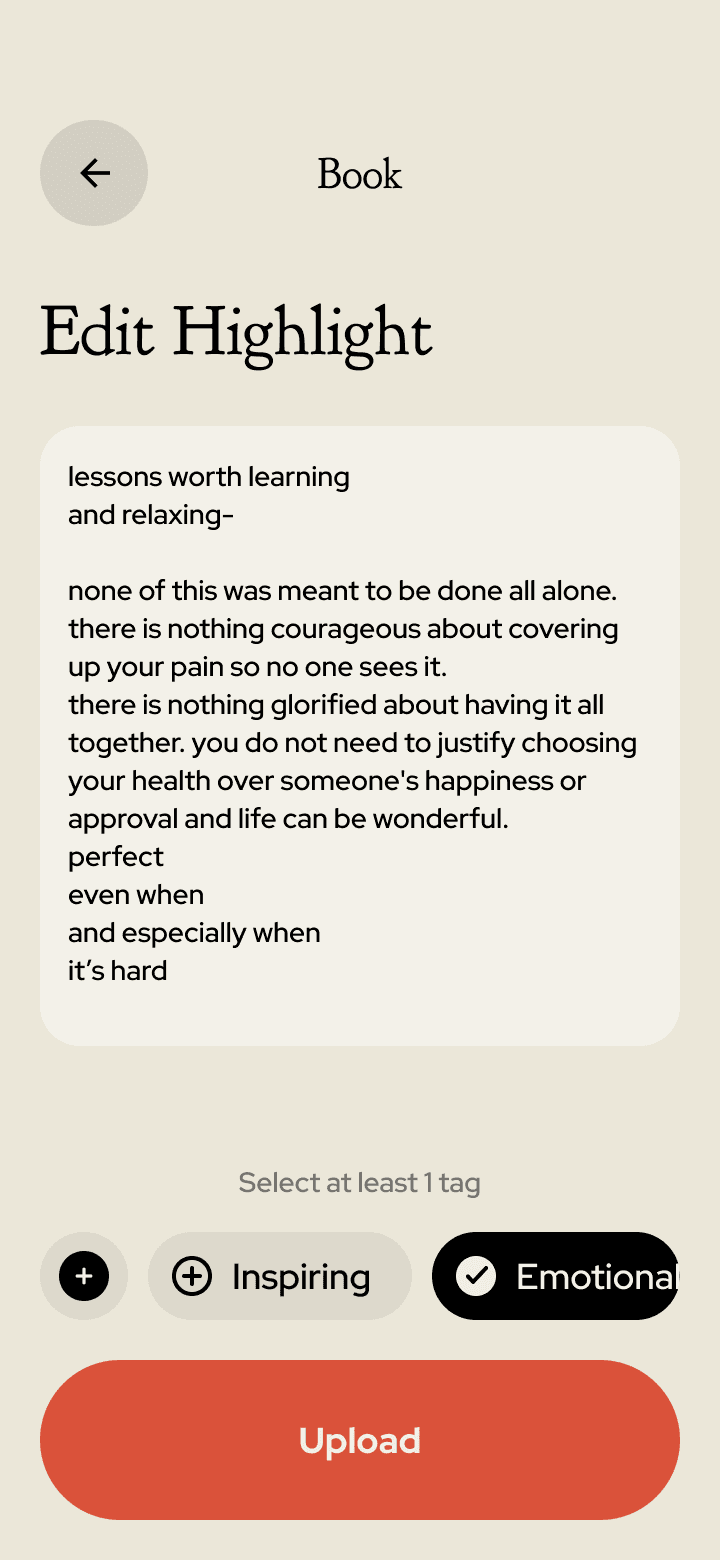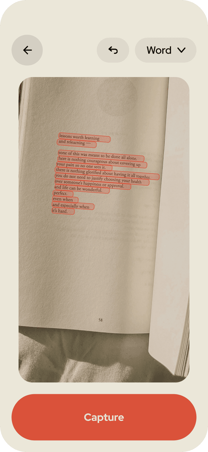 Booklyt lets you capture the sentences that move you without ever touching your book. Snap a photo, highlight the line, and keep reading.